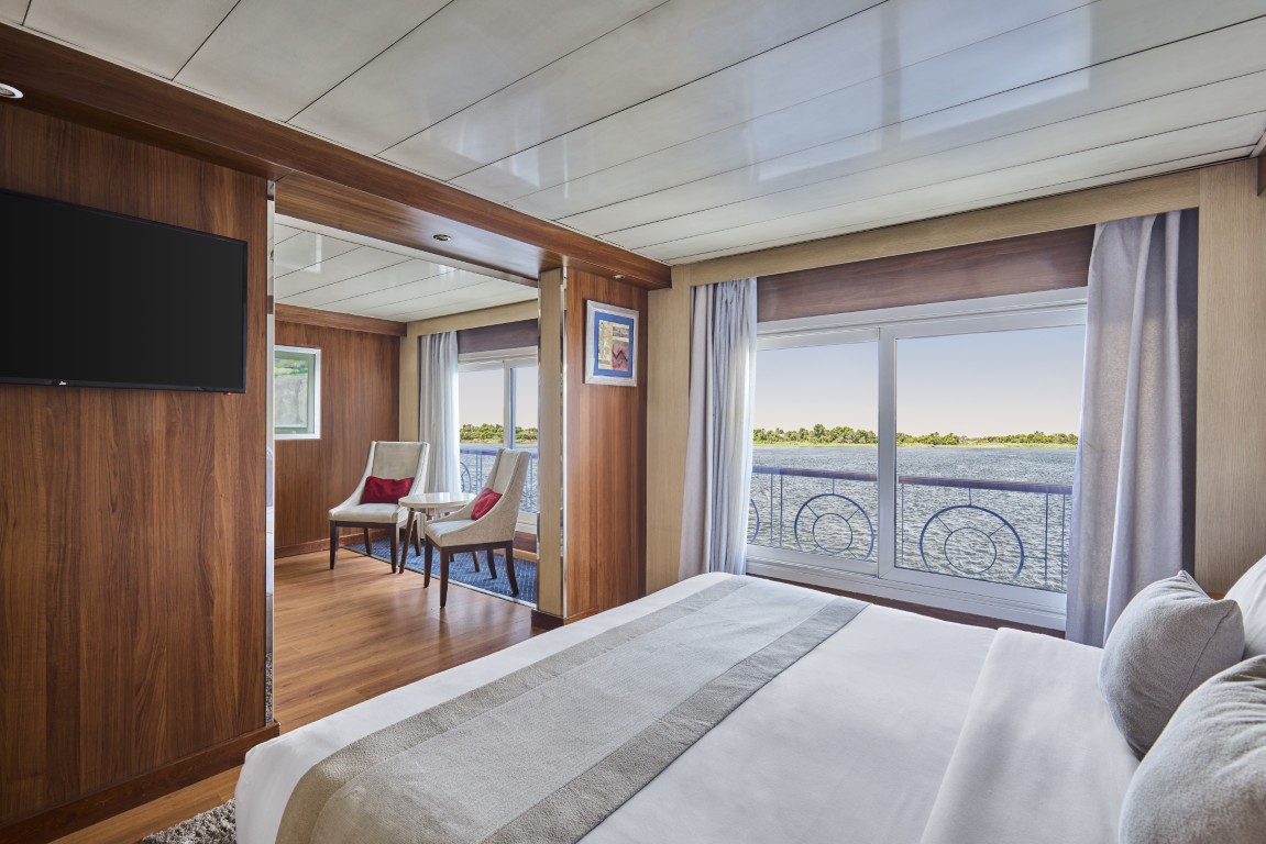 Every cabin also boasts a Juliet-style French balcony, and with all guest accommodation located on the middle and upper decks, you can enjoy Nile views straight from your room as you sail.
