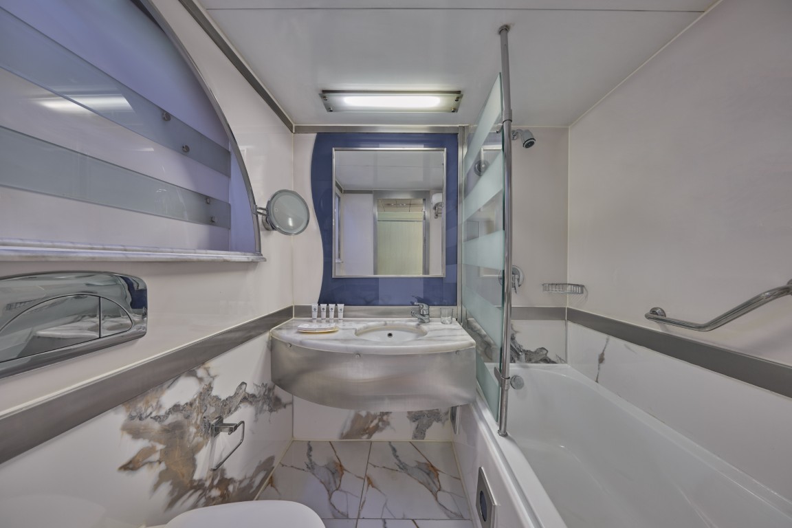 The suites offer extra luxury and space, with both Junior Suites and Royal Suites providing a more generous layout than the standard cabins. Each suite includes a comfortable seating area and enhanced amenities. Royal Suites even come with a Jacuzzi bathtub and a DVD player for in-cabin entertainment.