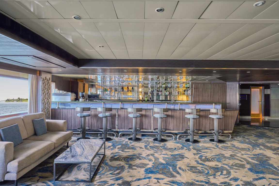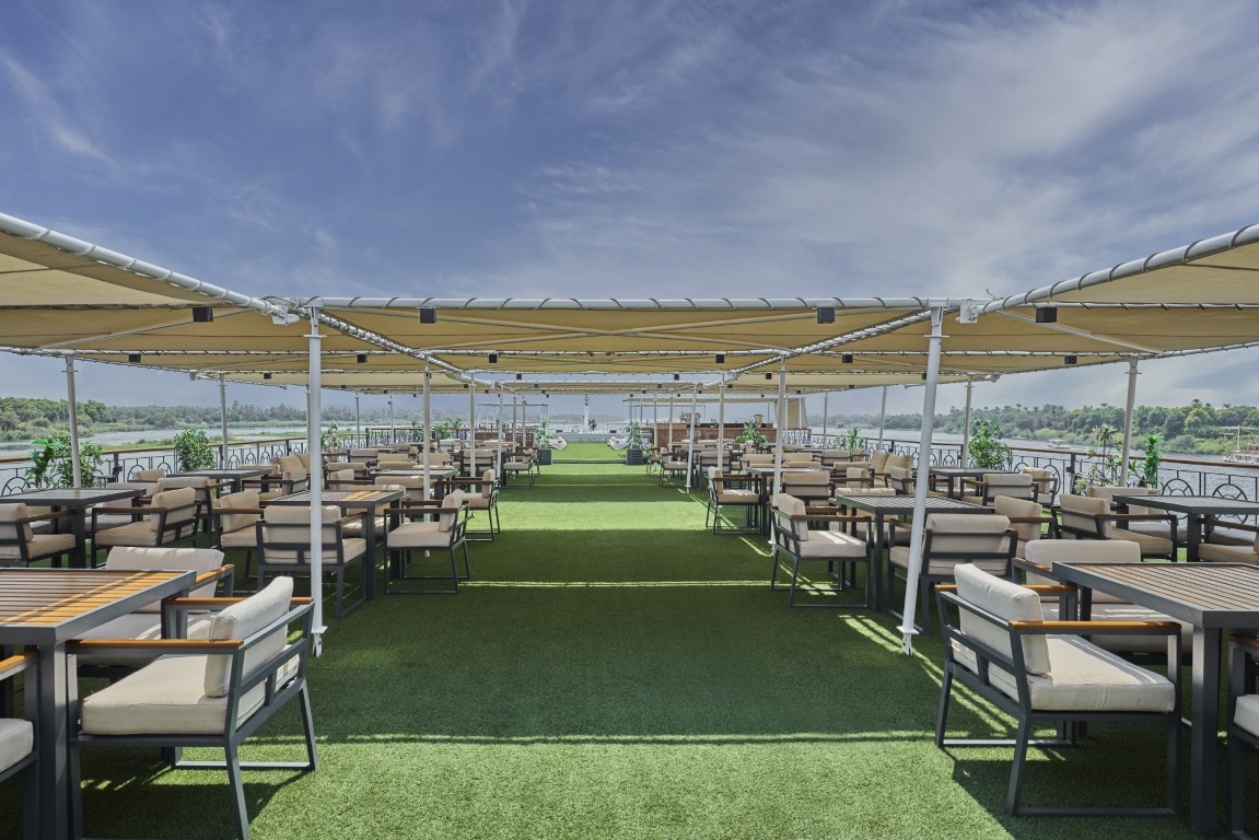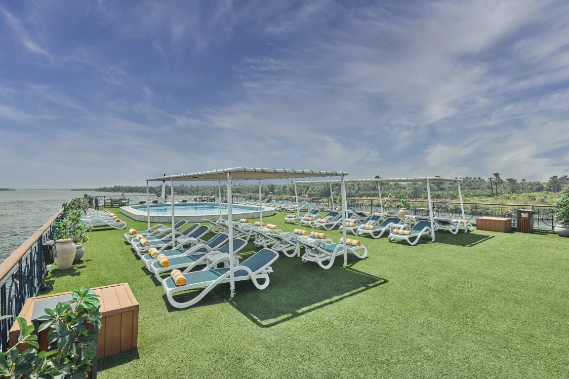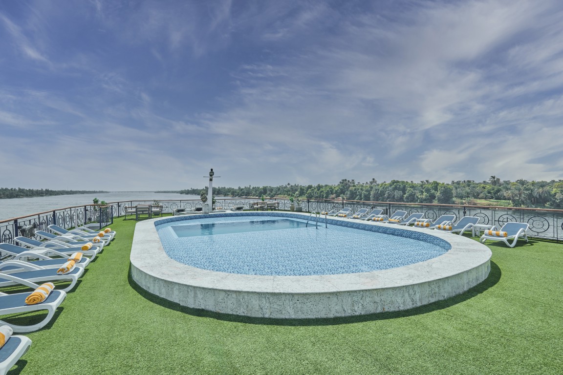 From the sun deck’s shaded loungers to the stylish indoor lounge, you’ll find plenty of places to unwind and socialise. The onboard facilities ensure you stay comfortable – whether you’re cooling off in the pool, sipping a cocktail as you watch the Nile scenery drift by, or enjoying an evening of music and dancing in the lounge.